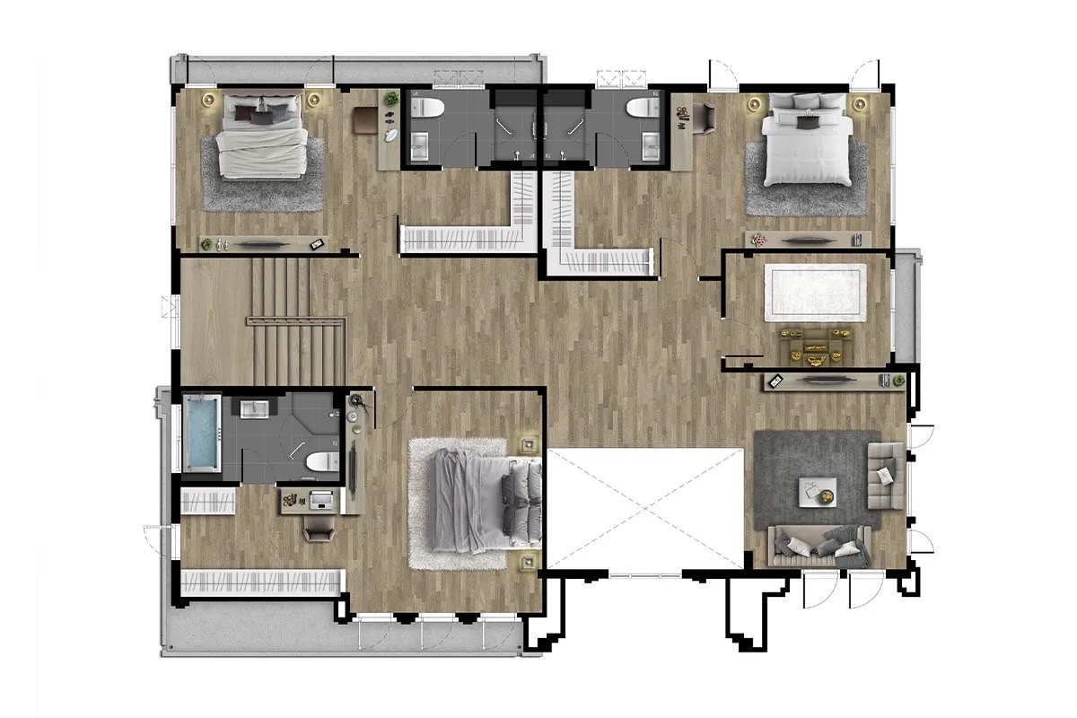 4 ห้องนอน (พร้อมห้องน้ำในตัวทุกห้อง), 5 ห้องน้ำ, 4 ที่จอดรถ